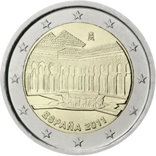 Para el anverso, se seleccionó la imagen más icónica del palacio: el Patio de los Leones. El grabado detalla la famosa fuente central de alabastro sostenida por doce leones, así como el intrincado sistema de columnas de los pórticos palaciegos que la rodean. En la parte inferior aparece la leyenda "ESPAÑA" y el año "2011", mientras que la marca de Ceca figura en la parte superior.