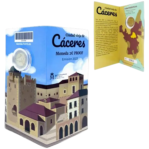 La monumental ciudad de Cáceres es la protagonista de la moneda UNESCO 2023. La FNMT captura la esencia medieval y renacentista de sus calles en esta moneda de 2 euros conmemorativa, ofrecida en calidad Proof para el disfrute de los coleccionistas.