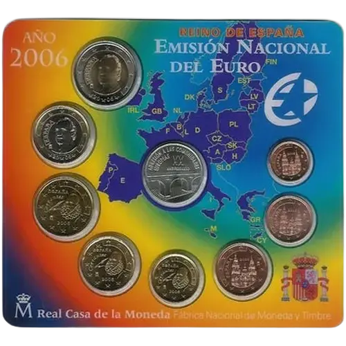 En el año 2006, la FNMT tomó la decisión de no realizar una emisión de set anual en calidad Proof, lo que generó un vacío temporal en las colecciones de alta gama. Para compensar a los coleccionistas y enriquecer la oferta anual, se lanzaron dos variantes especiales del set BU (Brilliant Uncirculated) acompañadas de medallas conmemorativas temáticas. Esta versión concreta, presentada en una carterita de tonos azules distintiva, conmemora el XX Aniversario de la Adhesión de España a las Comunidades Europeas (1986-2006), un hito político y económico fundamental que transformó el desarrollo moderno del país.