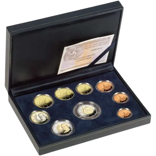Edición de gran lujo con una tirada muy restringida de tan solo 2.500 unidades. Este estuche es altamente demandado y valorado no solo en España, sino en toda Europa, por contener la versión Proof española de la moneda común del X Aniversario de la UEM. Al ser una emisión conjunta europea, los coleccionistas de toda la Eurozona buscan las variantes Proof de cada país para completar sus colecciones transversales, lo que dispara la demanda y el valor de mercado de este set específico.