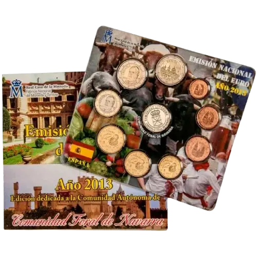 El set incluye las 9 monedas de curso legal de 2013 en calidad BU (incluyendo el 2€ Escorial) y una Medalla de Plata exclusiva con el escudo (las cadenas de Navarra) y motivos representativos de la región. Es una pieza de colección que une la riqueza cultural e histórica foral con la numismática del euro.
