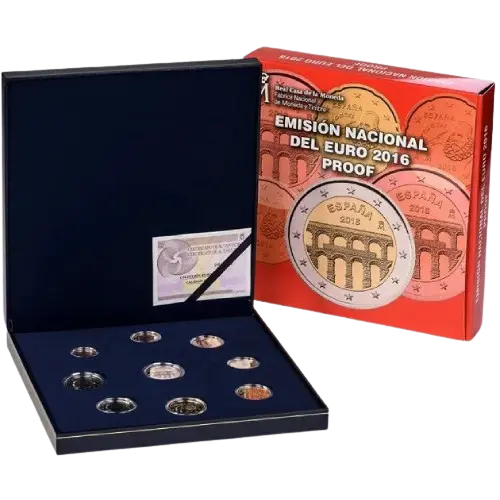 El estuche contiene la serie completa de 2016 en calidad Proof (9 monedas). Destaca poderosamente la moneda de 2 Euros del Acueducto de Segovia con su acabado de lujo. La técnica de acuñación Proof resalta la majestuosidad y solidez de los sillares de granito del acueducto romano mediante un contraste mate-brillo excepcional, otorgando a la moneda una profundidad, detalle y belleza que la versión circulante simplemente no puede igualar.