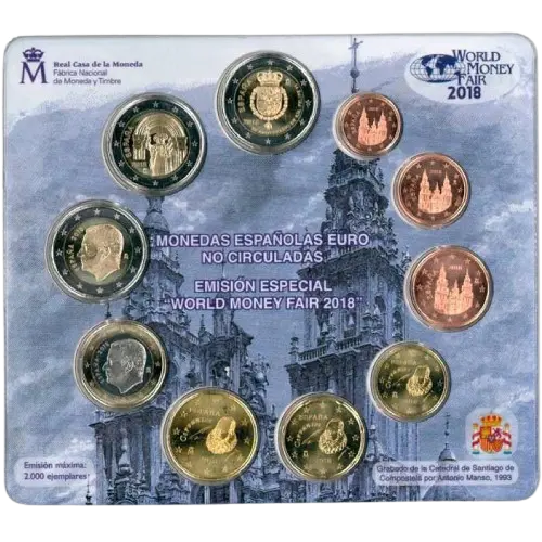 El contenido numismático es excepcional para un set de feria: incluye las 10 monedas de curso legal de 2018 en calidad BU (Brilliant Uncirculated). Esto significa que el coleccionista obtiene en un solo estuche raro las dos monedas conmemorativas del año: la dedicada a la ciudad santa de Santiago de Compostela y la que celebra el 50 Aniversario del Rey Felipe VI. Las monedas BU se seleccionan de los primeros ciclos de acuñación, garantizando un brillo y una superficie libres de los defectos propios de la producción masiva de circulación.